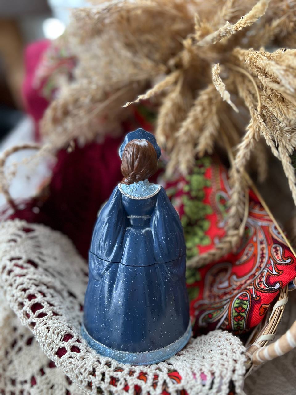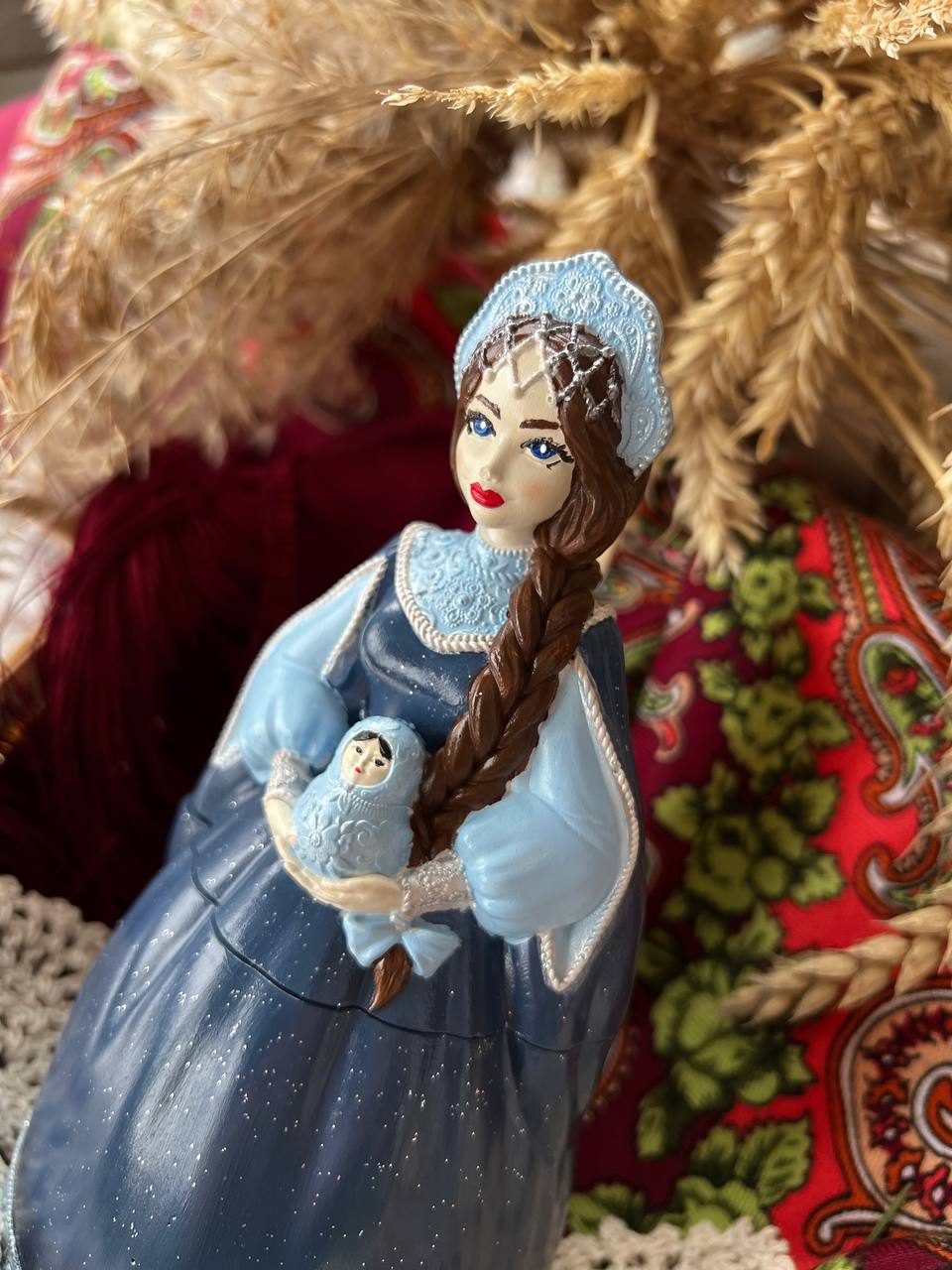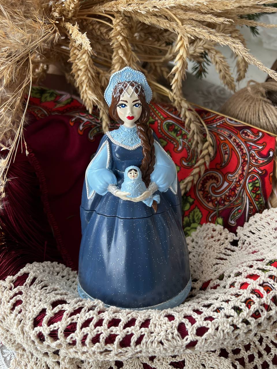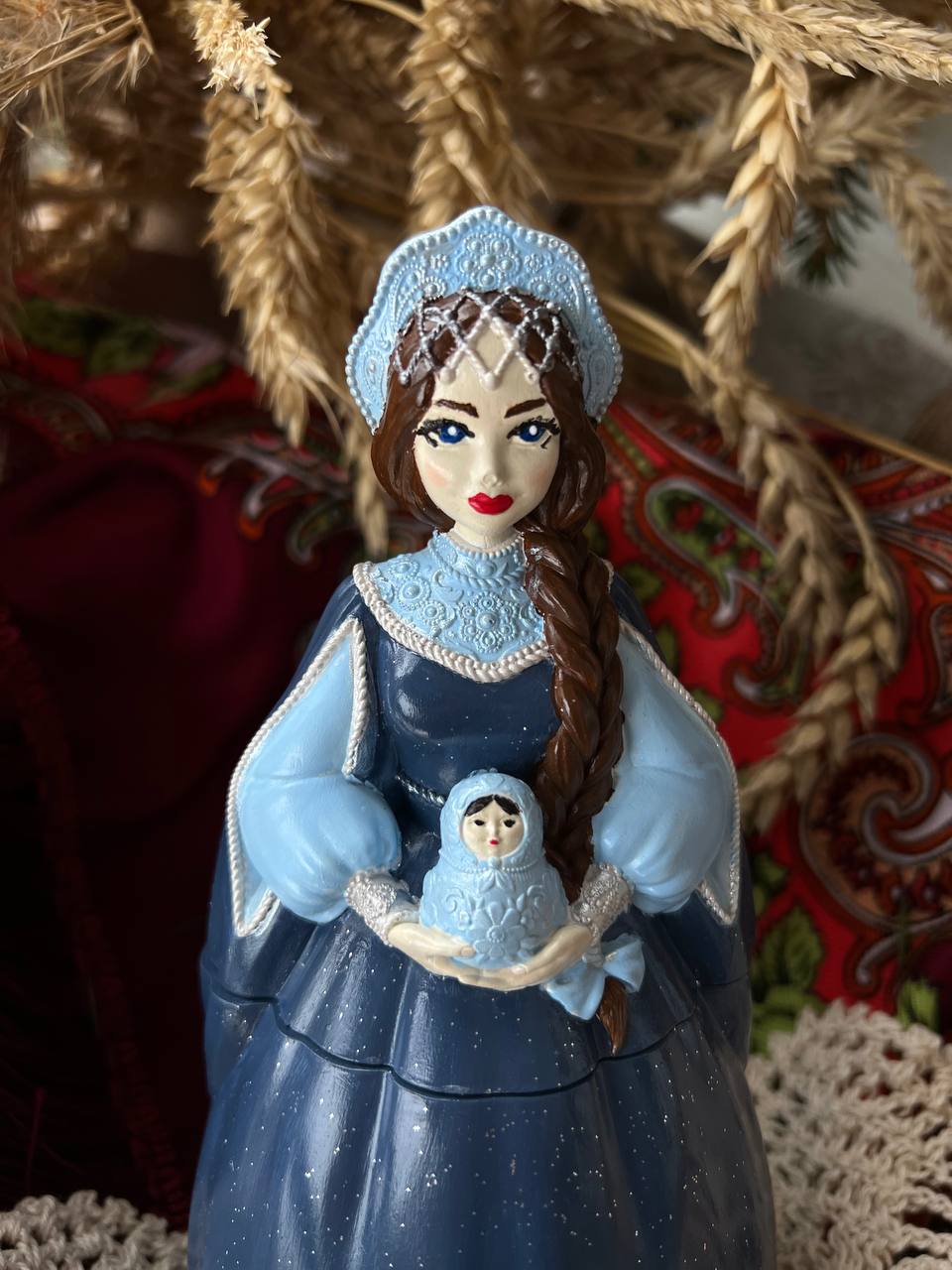 Шкатулка очень детализирована, девушка держит в руках Матрешку-символ России. Свеча символ красоты Русской души...